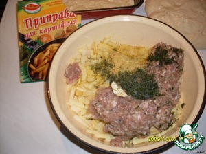 Добавить фарш, укроп и приправу для картофеля.