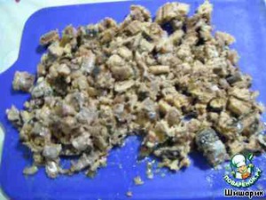 В это время режем рыбу на маленькие кусочки (можно использовать и консервированных кальмаров, тоже очень вкусно получается).