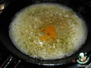 Потом заливаем двумя стаканами холодной воды, Добавляем специи по вкусу (я брала "Весеннюю зелень", приправу для рыбы и немного шафрана для придания рису желтизны).