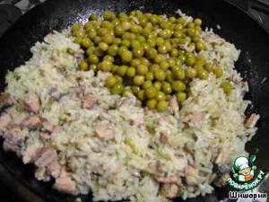 Берем один стакан длиннозёрного риса, банку консервов (у меня в этот раз была сайра) и банку зелёного горошка.