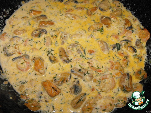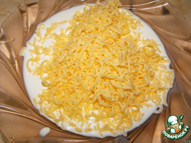 Приготовить соус. В сливки добавить вино (я не добавляла), тертый сыр, соль (если надо).