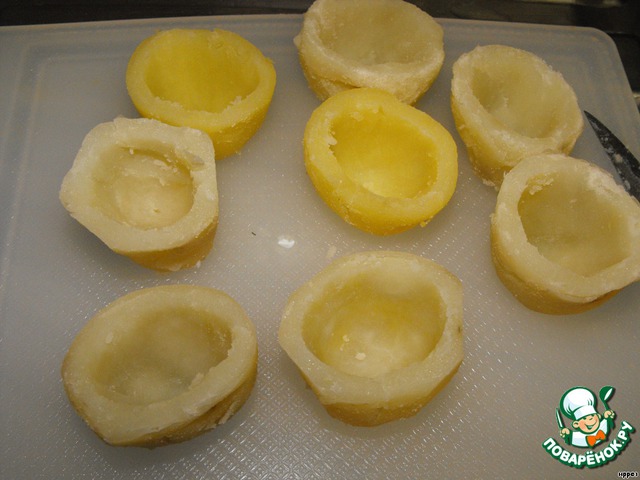Немного срезать "попки", чтобы придать стаканчикам устойчивость. Затем ложкой аккуратно вынуть серединку. -