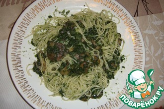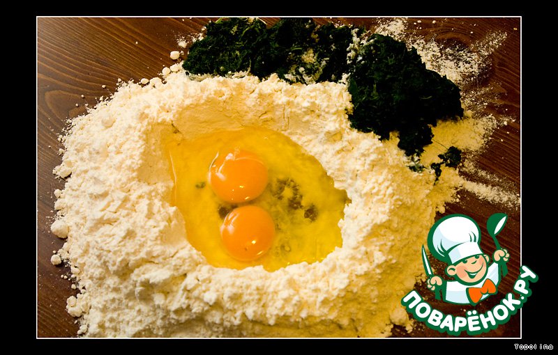 400 грамм муки, 2 яйца, 200 грамм шпината, 1 столовая ложка оливкового масла, соль, некоторое напряжение физических сил и немного терпения...