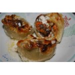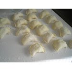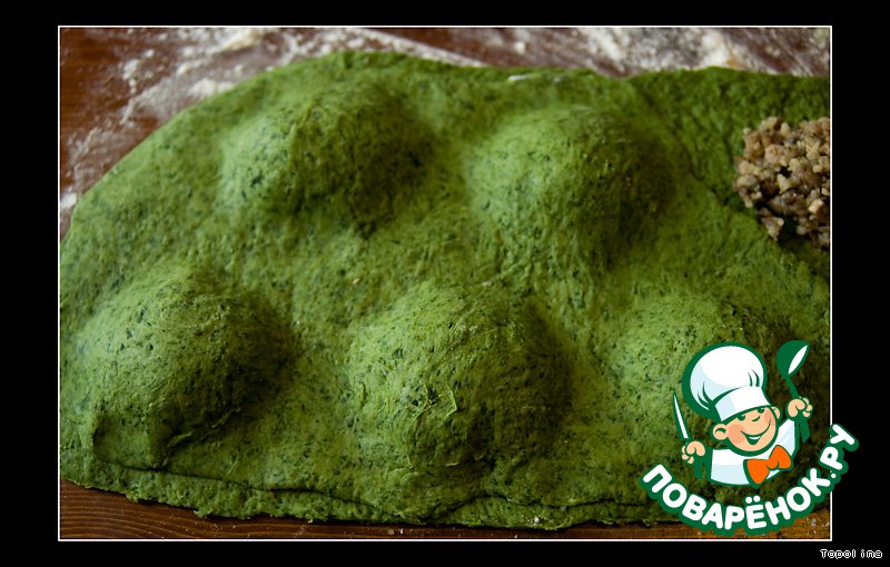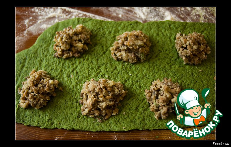 Раскатываем его любыми подручными средствами (машинка для пасты, скалка, бутылка из-под пива...) и чайной ложкой выкладываем на наш пласт теста начинку.