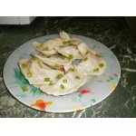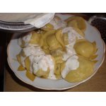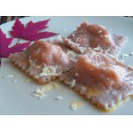 Ставим закипать воду для равиоли и принимаемся за соус. С лeгкой руки Oxana_71 я приготовила сегодня простенький, но эффектный соус из небольшого количества грудинки (слегка подрумянить на сковороде), сливок (выливаются к грудинке), сушeных грибов и зелени (у меня были сушeные укроп и петрушка).