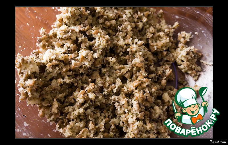 Грибы порежем и обжарим в сливочном масле (соль по вкусу). Затем, когда немного остынут, смешаем с измельчeнными сырами. Примерно вот до такой консистенции.