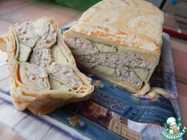 Верх закрываем концами блинов, накрываем пищевой пленкой и ставим форму под груз не менее, тчем на 10 часов.