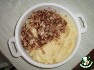 В картофель добавить молоко и сделать пюре. Добавить мясо с луком, перемешать.