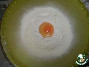 В просеянную муку разбиваем яйцо и добавляем 0,5 стакана холодной соленой воды.