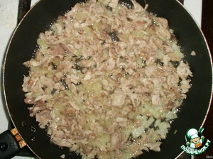 Лук и куриное мясо мелко нарезать и обжарить на растительном масле до хрустящей корочки.