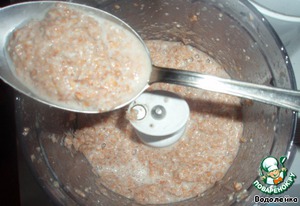 Теперь берем половину зерен вместе с жидкостью и перемалываем в блендере до состояния кашицы. Если выходит суховато, тогда добавить еще немного воды(с замоченной пшеницы).Остальная половинка так и продолжает дальше лежать в воде(она нам понадобится позже).