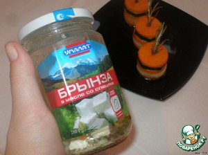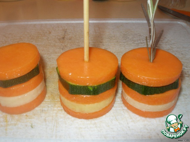Теперь деревянной шпажкой делаем отверстие в центре башенки. Стебли розмарина ломаем на 2-3 части и втыкаем в отверстие, скрепляя между собой овощные слои. (При "вырезании" слоев рекомендую нижний слой сделать немного толще остальных, т.к. он будет готов быстрее.)