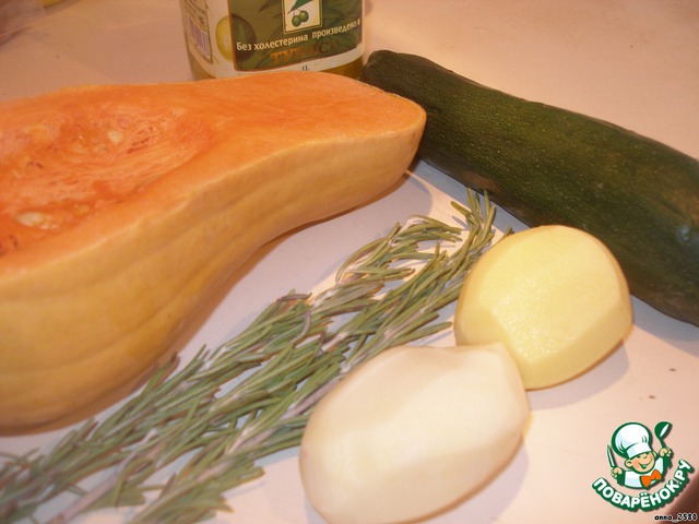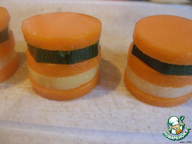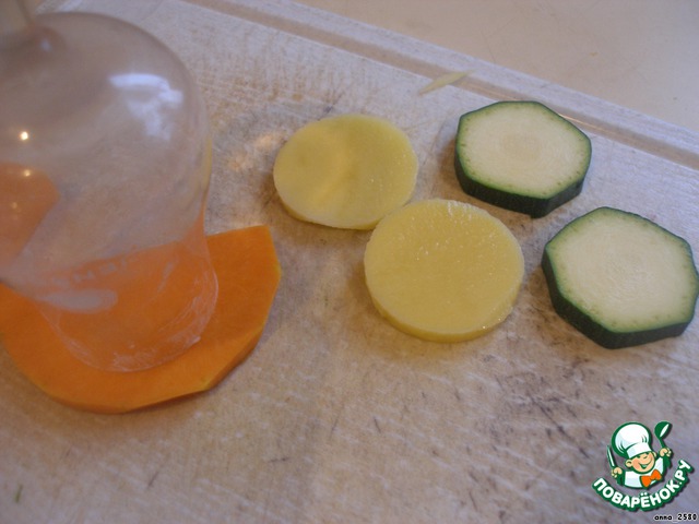 Цуккини нарезать кольцами шириной 0,5-0,7 см. Картофель и тыкву нарезать пластинами, шириной, как кольца цуккини. Затем рюмкой, бокалом или просто ножом вырезать из пластин тыквы и картофеля кольца, как цуккини.