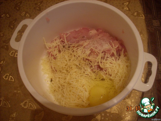 Перемешать курицу, сыр, яйцо, муку, соль, перец, приправу по вкусу.