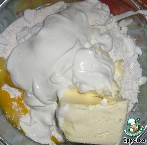 Для теста. Муку, сметану, желтки, маргарин хорошо перемешать.