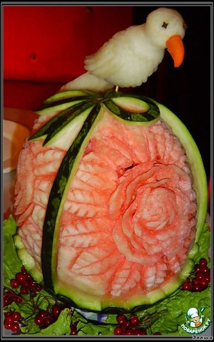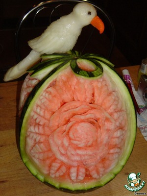 Карбовочным ножом формируем перышки, подрезая под ними мякоть, по всему тельцу попугая. Если нет карбовочного ножа, можно сделать перышки обычным ножом, для этого надо подрезать мякоть в виде уголков, и также под ними вырезать мякоть, чтобы они были похожи на перышки.