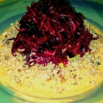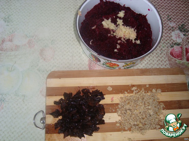Свеклу с чесноком трём на мелкой тёрке, орех крошим, чернослив мелко нарезаем. Всё перемешиваем с 1 столовой ложкой майонеза.