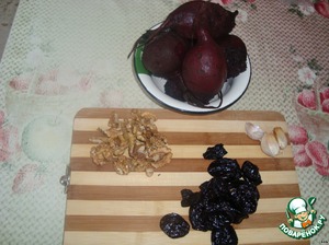 Берем вареную свеклу, чеснок, грецкий орех, чернослив. Заливаем чернослив кипятком на 10 минут.