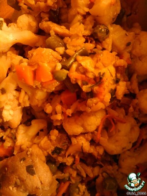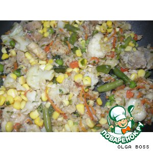 Добавляем к куриному мясу отваренный рис, лук с морковью, цветную капусту, стручковую фасоль и зеленый горошек. Тушим минут 5-6 периодически помешивая.