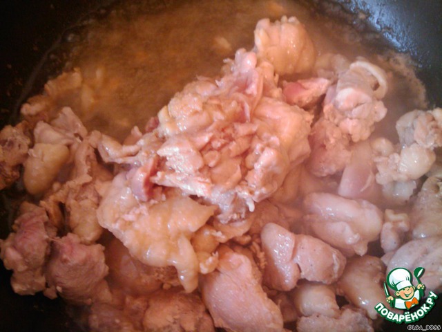 Ставим стакан воды на плиту и доводим ее до кипения. Промываем рис и варим его почти до готовности, он должен быть совсем немножко твердоват. Откидываем рис на дуршлаг. Обрезаем мясо с 2 окорочков. Ставим его тушиться в стакане воды минут 15-20 на небольшом огне.