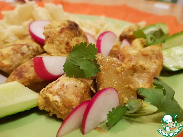 Пока курица жарится, чистим манго и нарезаем небольшими кусочками.