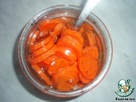 Как только морковка стала такой как надо, сливаем ее и перекладываем в чистую баночку. Заливаем нашим маринадом, так чтоб маринад покрыл морковку полностью. Закрываем крышкой, даем остыть и ставим в холодильник. Через сутки можно кушать, но чем дольше стоит, тем вкуснее.