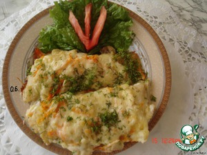 На противень, смазанный маслом, уложить рыбу, сверху приготовленную начинку, ставим в духовку на 20 минут (смотрим по своей духовке).