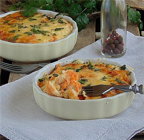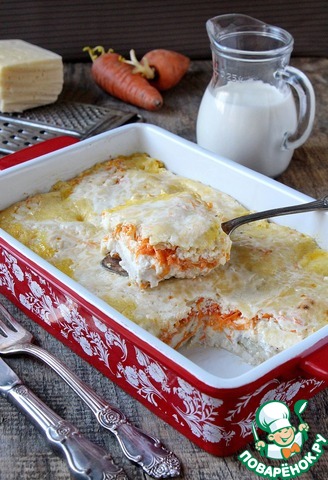 Трем морковь на мелкой терке и укладываем сверху, ставим опять в духовку на 5-7 минут.