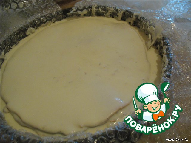 Коржи должны быть чуть мегьше в диаметре формы разъемной, чтобы бока тоже были залиты кремом. Если пекли в этой же форме, то коржи промазать и немного по кругу обрезать. Залить бока оставшимся кремом - будет с верхом.