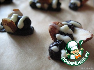 Пчелок делала из расплавленного шоколада черного и белого (полосочки). Крылья делала из пластинок миндаля.