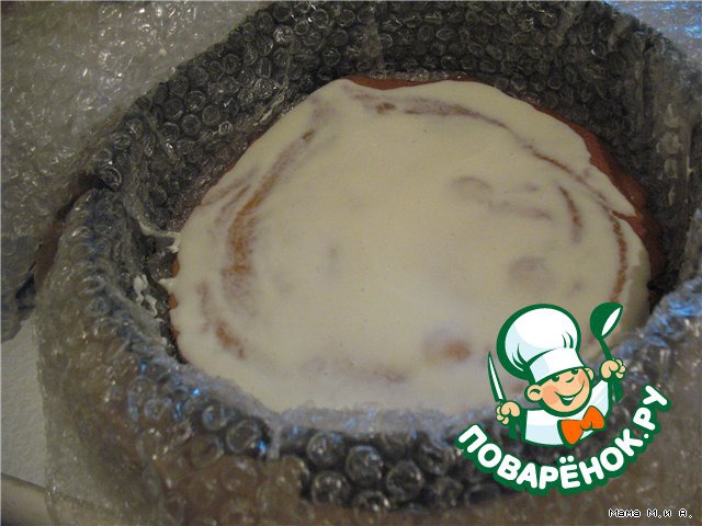 В желтковый крем осторожно ввести сметану, и затем взбитые сливки. Промазать коржи кремом, я для этого помещаю торт в разьемную форму, обкладываю пленкой с пузырьками, которой технику предохраняют от падения (имитация сот), и чуть прижимаю торт, оставляю застывать в холодильнике на 6 ч или ночь. -