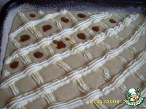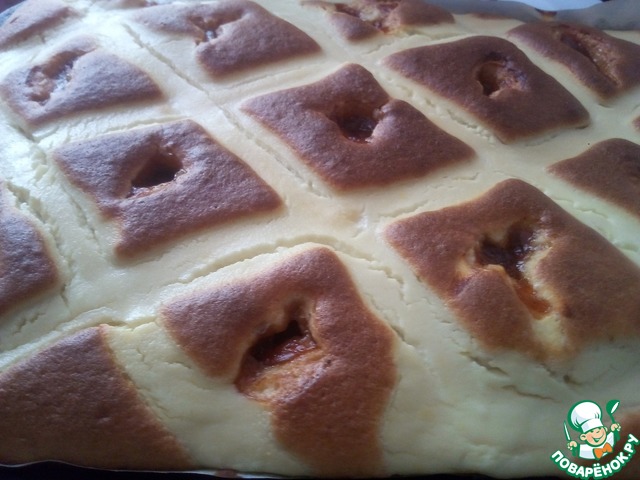 Листик поглубже вымазать холодным маслом или маргарином. Посыпать панировочными сухарями. Вылить в него тесто. На тесто нанести решетку из творога. В образовавшиеся ромбики положить повидло. Выпекать около 30 мин. -