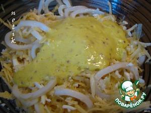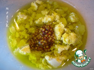 Приготовить заправку: желтки, 3 ст. ложки оливкового масла и 1 ст.л. французской горчицы перемешать до однородного состояния (как майонез)