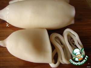 Кальмары отварить в кипящей подсоленной воде в течение 3-5 мин., охладить и нарезать тонкими колечками.