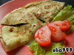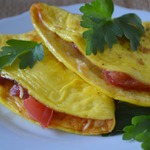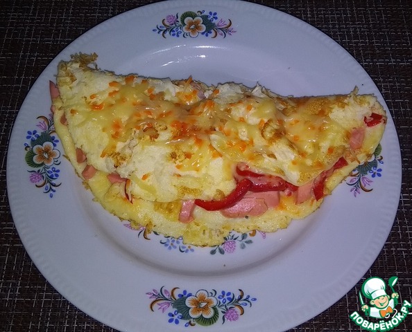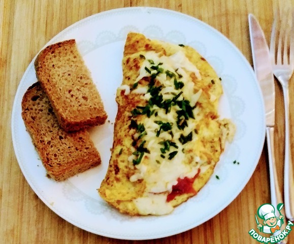 Я затем убавляю температуру и прикрываю крышкой. Через пару минут, когда омлет хорошо схватится и прожарится с нижней стороны, аккуратно перевернуть. -