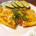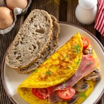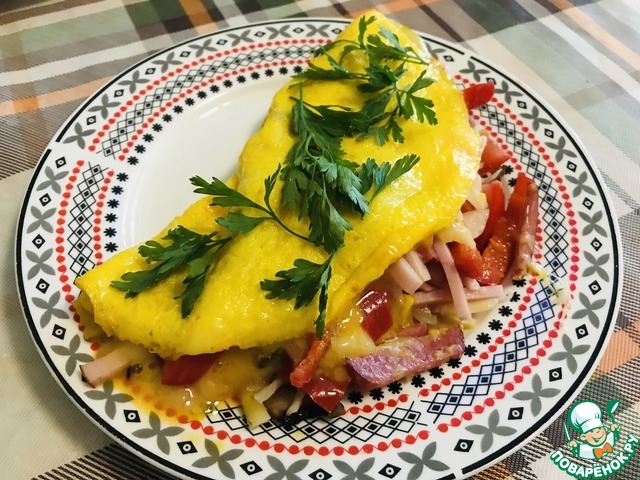Выложить начинку на половину омлета. Прикрыть второй половиной, прижать пару раз.