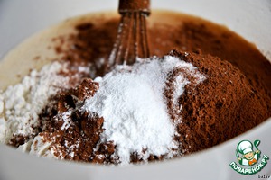 Добавляем муку, какао, разрыхлитель теста и соль, снова взбиваем.