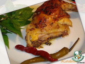 А я не пихала... я готовила курочку по изобретённому мной приципу "табака" - то бишь курочку разрезаем по животику, расплёскиваем как жабку, придавливая суставы и косточки, чтоб она стала как "табака" - вот!