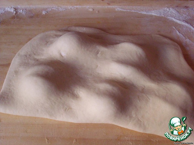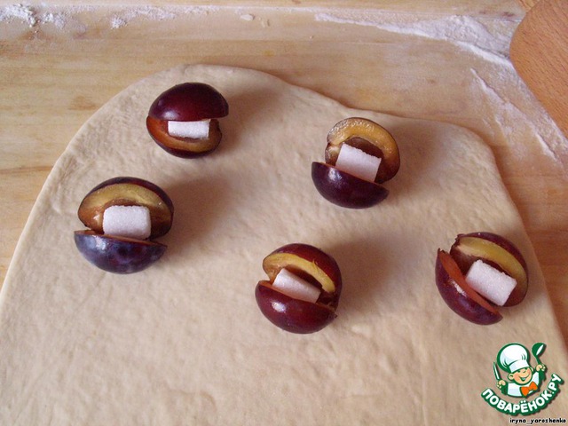 Тесто раскатаем в один пласт. На половину пласта выложим сливы. В каждую из них положим полкусочка сахара рафинада. -