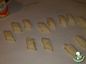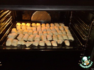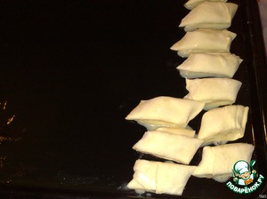После выкладываем на противень нарезанные рулетики. Сверху мажем их взбитым яйцом.