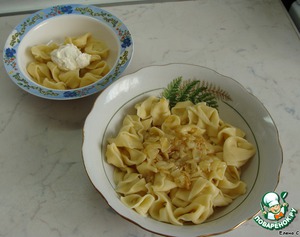 Пока вертелись галушки, должна закипеть подсоленная вода. Отвариваем наши изделия до готовности. Я разделила на две неравные части. В бОльшую положила обжаренный лук, в меньшую (для младшего сынули)- сметану.