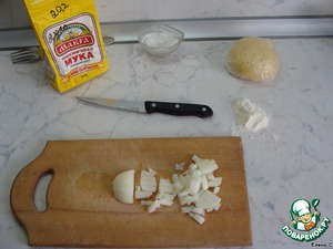 Пока тесто отдыхает, поставим кастрюлю с водой на плиту и порежем лук, кому как нравится.