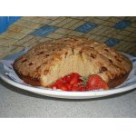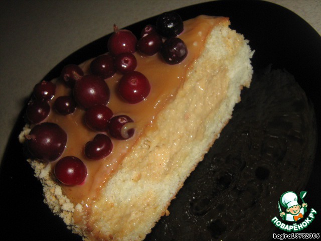 Верх пирога я смазала вареной сгущенкой и украсила ягодами. К сожалению, сейчас не сезон ягод, поэтому, обошлась тем, что было в холодильнике. -