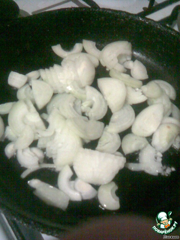 • Тем временем готовим начинку. Лук режем полукольцами и обжариваем на растительном масле.
