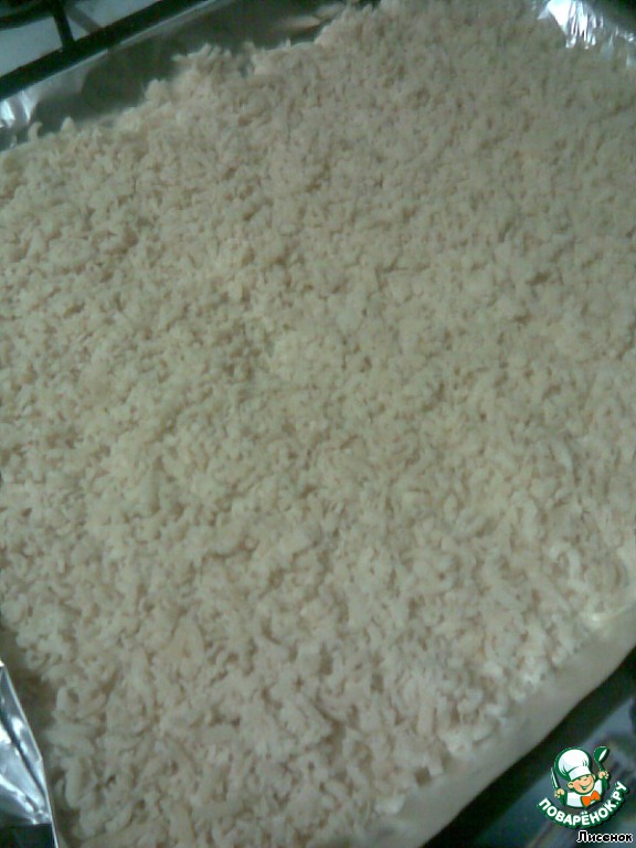 • Замерзшее тесто, большую часть, трем на крупной терке на противень. Разровнять (у меня не было бумаги для выпечки, застелила фольгой).