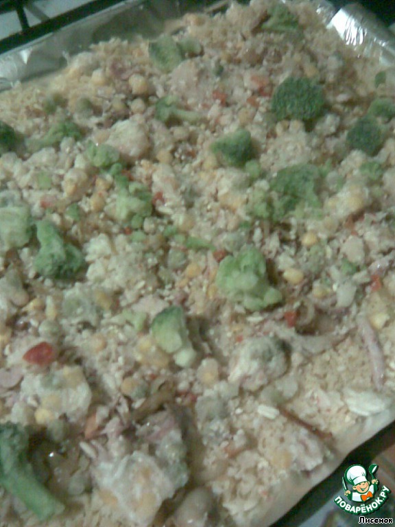 • Потом выложить жареный лук, гавайскую смесь и брокколи (люблю ее оченно:-[ ). Яйца взбить и полить начинку сверху (сфоткать забыла).