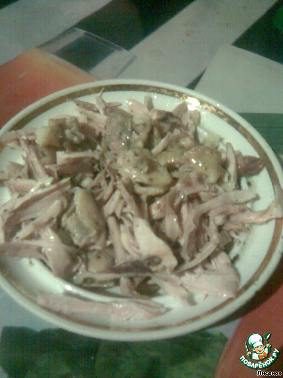 • Окорочок отвариваем в специях (соль, перец черный, приправы для птицы и гранулированный чеснок). Готовый окорочок рвем на волокна.
