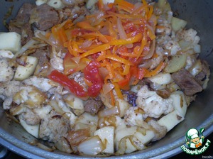 • мясо, картофель и белокочаную капусту кубиками. Цветную капусту разбираем на небольшие соцветия.