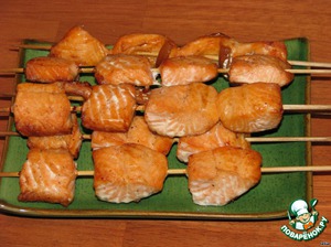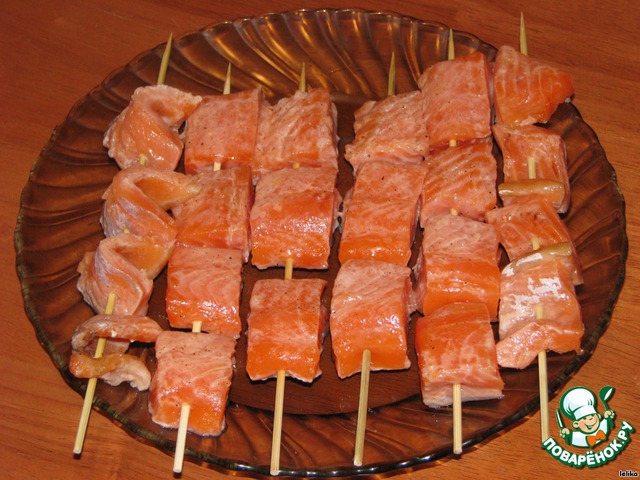Нанизываем наши кусочки на шпажки, предварительно замоченные в воде, и смазываем кисточкой лимонной смесью