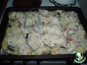 Через 20-30 минут вынуть противень с картофелем из духовки и положить рыбу на дно противня так, чтобы картофель с грибами был вокруг рыбы. Оставшимся маринадом полить сверху. Добавить часть сыра и отправить в духовку.